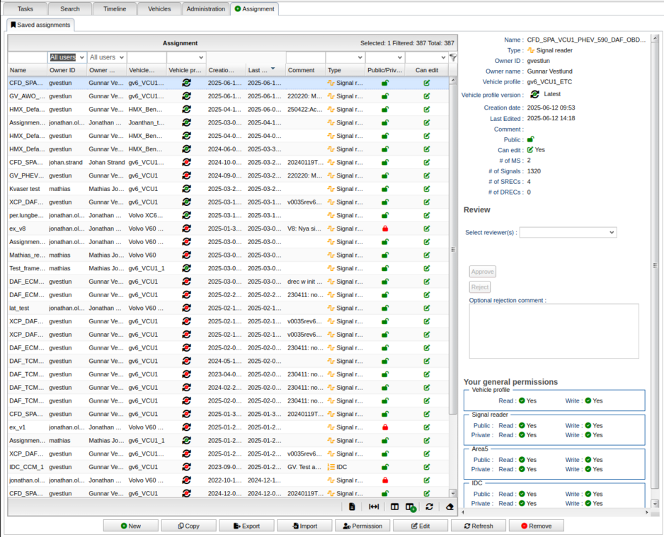 This panel is for managing assignments. In this version it is signal reader, Area5 and IDC assignments that are possible to handle. Here you can view, edit and copy saved assignments and create a new one. This window will initially not show any assignment and you need to search or click on “Refresh”. If you are only interested in one type of assignment you can select the specific type at the “Type” column. Which columns that are visible can be managed with the views button in the bottom right of the table. Read more about views here. When selecting an assignment in the table the right panel will show a summary of the assignment.