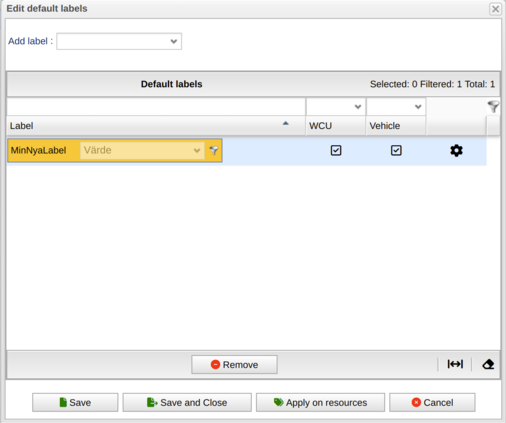 Default labels are a group of labels that will be added to WCU or/and vehicle when wcu joins the resource group. These labels will not affect current WCU/Vehicle in the resource group. Labels are added from “Add label”. Search or select labels that you want to add and then click on it. Then it will be added to the list below and here you can set value (if the label can have value) and if it should be added to the WCU, vehicle or both. Click on specific labels settings gear to set if the label should remove when WCU or/and vehicle disconnect from the resource group.