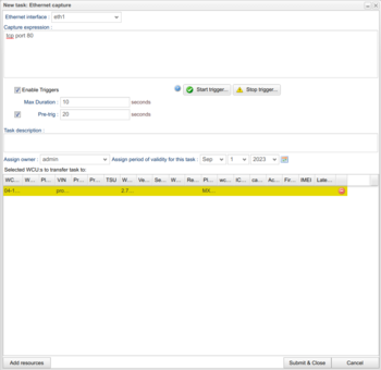 The ethernet capture task and module can capture ethernet traffic from interfaces on the WCU in a format known as pcap. This is a standarized format of saving packet information and can be used in many tools to be analyzed. As there can be a lot of traffic on ethernet interfaces, there is an option to enter a filtering expression (Capture expression) to only capture certain packets of interest. Examples and descriptions of filter expressions can be found here and here.