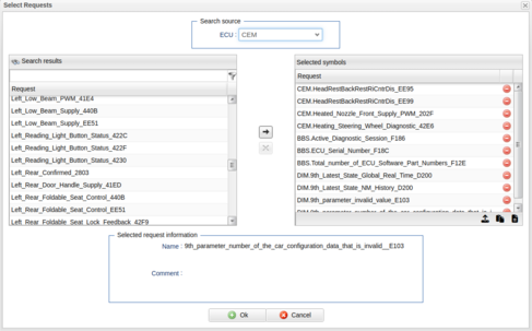 When selecting requests you must first choose the source ECU, though you may select requests from multiple different ECUs into the same assignment by changing the source. You may also add requests by importing from either clipboard or from file, granted that they exist in the active Vehicle Profile.