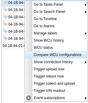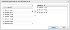 A previous feature has been to compare a groups configuration with that of its resources. This has now been implemented for individual WCUs as well. Comparing individual WCU configurations is accessible via the right-click menu on a selected WCU in the vehicles tab. From there you open a dialog where you can select multiple other WCUs to compare against the current WCU. Pressing 'Compare' will then open a result panel displaying the differing configuration variables for each of the selected WCUs.