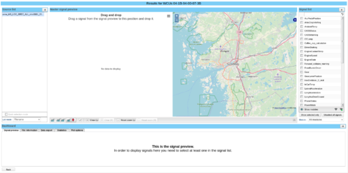 The available signals for the selected file are listed in the the "Signal list", marked to the right in Figure "Plot Selected Signals". When a signal is selected it is shown in the bottom "Dashboard"-section under the "Signal preview"-tab. To deselect a signal, either uncheck the corresponding checkbox or close down its window in the "Signal preview"-tab.
