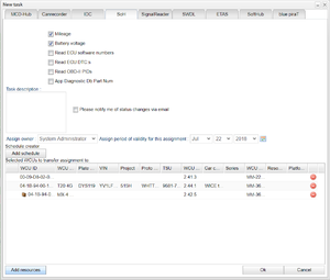 Now that you are logged in you create a new task by clicking the "New Task" button at the bottom of the screen. When pressing the button a dialog will be shown with one tab for each type of assignment. To make the task a SoH task you click the SoH tab where the options for creating one will be shown. There you will at the top see six different checkboxes with different data items that SoH can collect. Check the boxes for voltage and mileage and scroll down to click "Add resources". A window will appear where we can search and add WCUs. You can search for a WCU by different criterea and when you have found the WCU(s) you wanted and have dragged them to the bottom box with the selected WCUs you press "Done". Now it should look like it does in figure 3 and you can now press "OK" to start the task. We don't need to fill the other boxes as we don't need a description, notification about status via email or schedule. That was a quick instruction on how to create a new task but you can read more detailed about how to create every sort of task at Creating a Task.