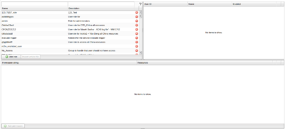 When you select a role in the top left table, the lower table shows that specific role's permissions and the upper right table shows which users have that role. The permissions table consists of two columns, a string that is the actual permission and the set of resources that apply to that permission.