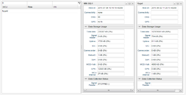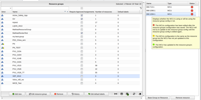 Here are both WCUs and cars part of the group. In addition to the type there is a column named “Status”. That column only applies to WCUs. The use of this column is as follows. Assume you have a resource group consisting of 50 WCUs. Further, lets make a configuration change to that resource group. Depending on where the WCUs geographically are and how they are used the WCUs will be updated at different times. How do you you know when all WCUs are up to date in the resource group? You could check them individually in the “Vehicles” panel but that is not very elegant and time saving. Instead, just watch the “Status” column for the WCUs. When a WCU is up to date with respect to the group configuration the color in the column will be green. The value is updated each 30 seconds.