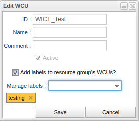 If the selected WCU is a resource group the dialog will appear as presented in Figure "Edit WCU Dialog". The difference here is the "Apply label to resource group's WCUs"checkbox. When this option is selected the labels selected in the "Manage labels"-selector are also added to the WCUs included in the resource group. It is, though, not possible to remove labels from the resource group's WCUs using this checkbox. To do so use instead the context menu options for label management.