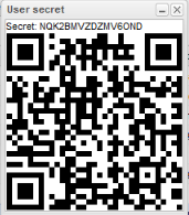 A QR-code is shown that can be transferred to a smart phone by simply starting the authenticator app (we recommend using "Google Authenticator"), point it at the screen and let the phone read the QR-code. An example of such a QR-code can be seen in Figure "QR-code Window". If the application that is to be used as a password generator do not support QR codes, the secret is shown in clear text at the top.