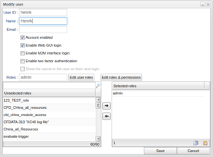 You can at any time modify a user by pressing the “Modify” button to bring up the dialog in Figure "Modify User Dialog". The User ID cannot be changed. A disabled account can not be used for logging onto the portal even if the correct user name and password are given. To modify the user roles, select or deselect a role by using the check boxes. To turn on two-factor authentication for a user, check the appropriate box. When you are satisfied with your modifications, press the “Save” button to make them permanent on the portal or press the “Cancel” button if you change your mind.