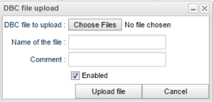 A CAN bus needs to be associated with a DBC file and when defining a CAN interface one have the option to select an already upload DBC file or upload a new one. Uploading DBC files can be done via the DBC files portlet (described in #Manage DBC files) or directly in the select DBC files grid shown in Figure "Select DBC Files Grid".