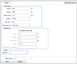 The settings for the monitoring group are basically the same as the recording group above. However, make sure not to set these settings too high, i.e. too a high resolution and frame rate as this is sent in real time over the network and video can consume quite some bandwidth. Typically do not set the resolution above 640 x 320 with a frame rate of 25 frames a second, at least not when using jpeg. If using higher resolutions and/or frame rates, make sure to use VP8.
