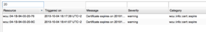 This alarm is identified with 'wcu::info::cert::expire'. Currently, alarms start to appear from 30 days of certificate expiry date. The alarm is triggered at most once per 24 hours.