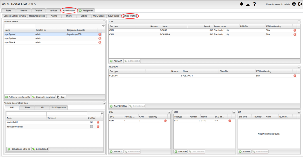 As an administrator, it is possible to define vehicle profiles from version 2.45 of the WICE portal. The vehicle profiles panel is located in the the administration tab as can be seen in Figure "Vehicle Profiles Panel".