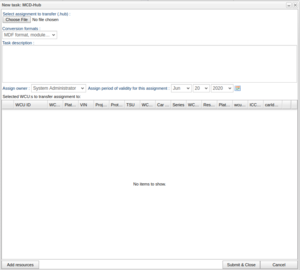 6. Start searching and selecting target WCUs by pressing add resources at the bottom left of the screen. There you will get a pop up with two boxes, the upper one for searching cars and the bottom one for selected cars. In the top one you can search for WCUs using ten different parameters by writing a value and pressing search or ENTER. To select a WCU you drag it from the top to the bottom box so that it appears in the bottom one.