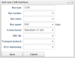 To define a new CAN interface for a custom car type, select the car type in the "Car types" portlet and then click "Add CAN" in the CAN portlet. This will open up the dialog as can be seen in Figure "Add CAN Dialog".