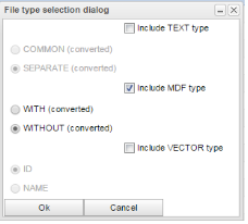 At the top we have some information regarding the task such as the ID and description. Next is a field to hide the search field to make room for the table with the list of files. There are 4 different kinds of search criteria you use to filter out the result files you are interested in: the date, file name, the size of the file and the type of file. As you type your different criteria in the search fields, the “Available files:” entry reflects the number of files that would be listed if you hit the “Search Files” button. Depending on the type of assignment you will be presented with a potentially differing set of buttons and controls. In the illustration above an MCD-Hub assignment was selected. To choose the subtype for a file, use the radio buttons for each of the types MDF, Vector and Text. The subtype selection is only enabled if the corresponding file type is checked.