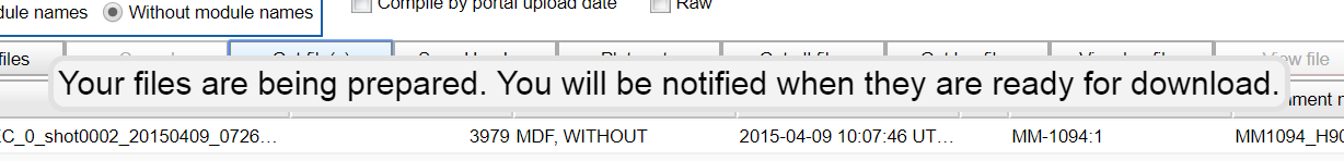 Depending on the number of files and sizes of the result files, it can take a considerable time to zip the files together before they are ready for download. Therefore, files are zipped and getting ready in the background on the server and when they are ready for download you will be notified with a toast message at the top next to the download dialog icon. The icon can be found in the tool strip at the top depicted in Illustration 19 below.
