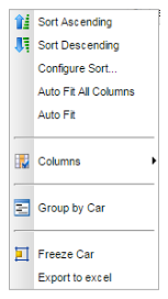 There is an option to save which columns you are interested in to see. By clicking on the button “Save headers” the currently shown columns are saved and restored when you log in the next time. Right-clicking in the header will bring up menu where you can among other things select which columns should be visible in the table of results. The order of the columns can also be change by simply dragging a column to a new position. When saving the set of columns, the order of them is also saved on the server. The drop down menu of the table header is in Illustration 16. The current table can be exported to an excel sheet by selecting “Export to excel”.