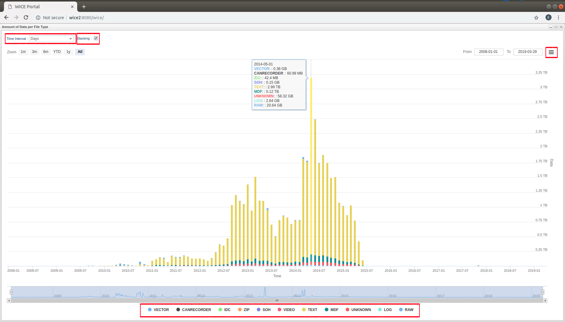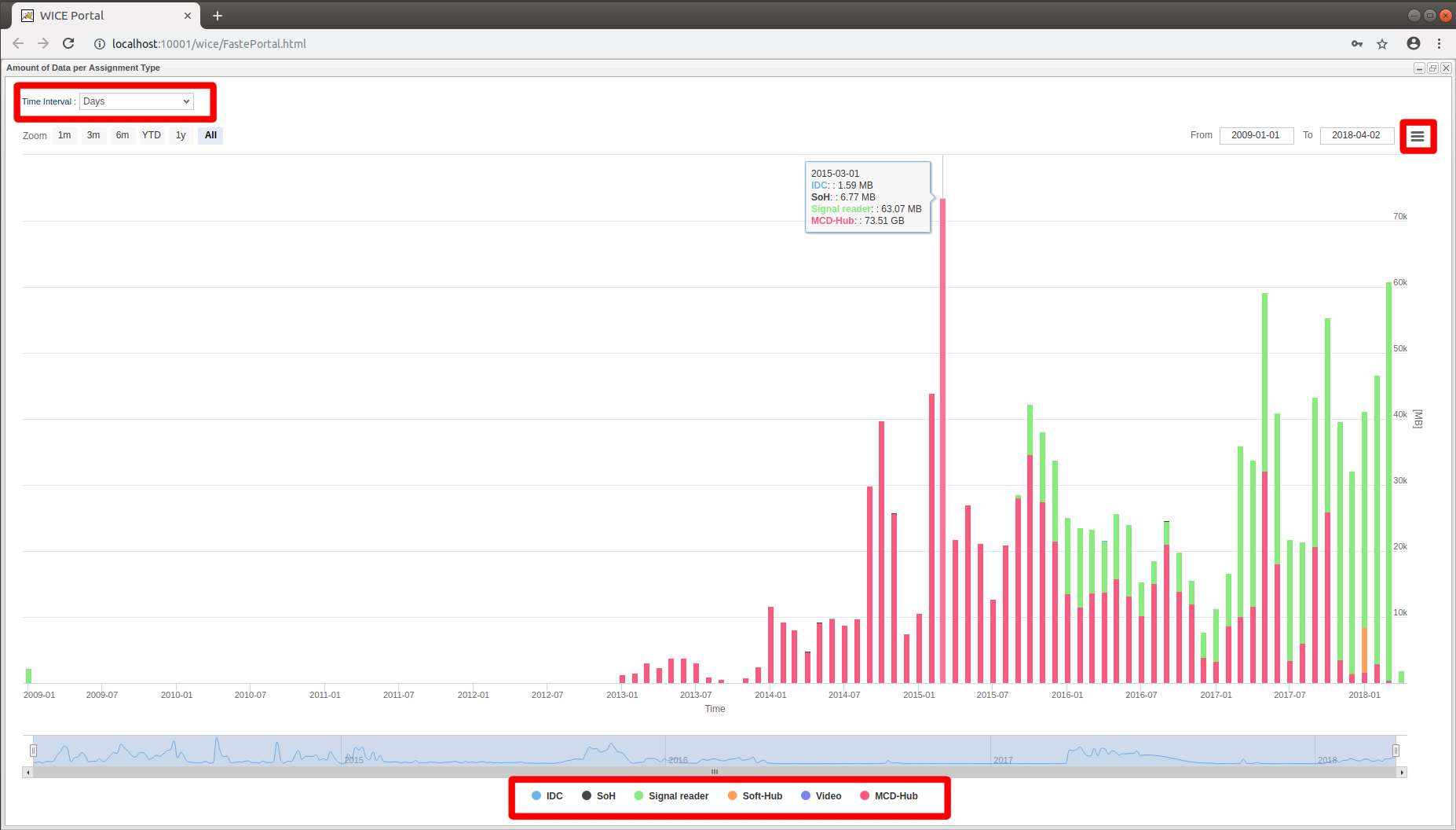 Key Figures chart pointing out three basic functionalities. In the upper left corner there is a drop down menu for selecting the time sampling interval. In the upper right corner you find a menu used for export of the chart image and data. Finally, below the chart there is a clickable legend which can be used to select and deselect the available data series.