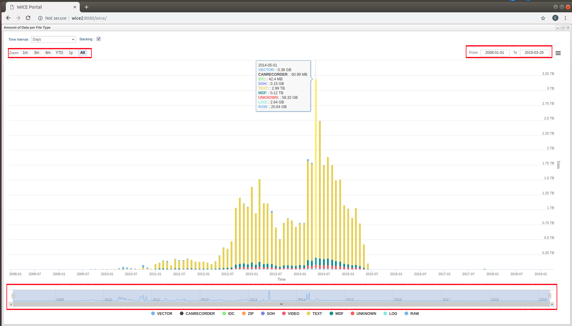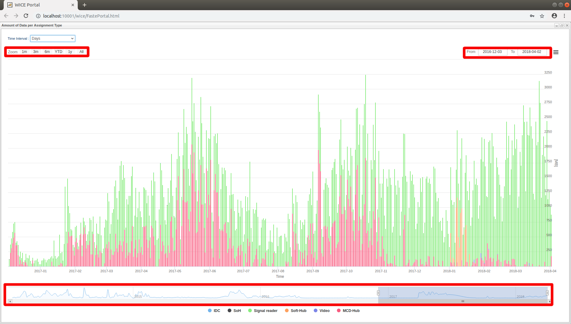 Key Figures chart pointing out three different manners in which it is possible to zoom. In the upper left corner there are options which can be used to zoom to 1- 3- or 6 months, from the start of this year to this day "YTD", view one year or the entire interval in which there is data, "All". This selected time interval can also be moved around using the navigator marked out in the bottom of the chart, which also can be used to resize the interval. In the upper right corner you find a date selector used to display data in between certain dates.