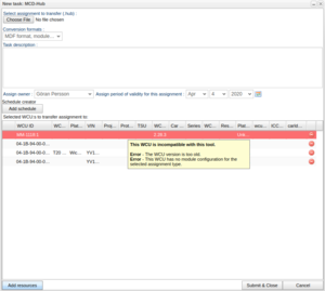 If you add a WCU and return to the New task window you can end up with having one or more lines, in the selected WCUs table, with red background. This means that the WCU does not have the current tool installed. An example of this can be seen in Figure "Incompatible Resources".