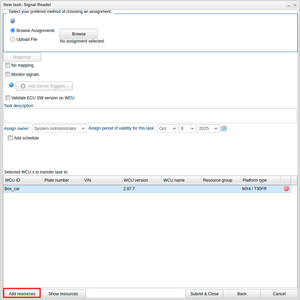 To create a new task, first select task type in the window presented in Figure "New Task Window". Learn more about how to go about creating a new task here. When a task is chosen, you can select target WCUs for the task by clicking the "Add resources"-button, presented in Figure "Add Resources to Task". As the illustration shows, the area where WCU's where added and removed to the task is a table very similar to the that in the Vehicles tab. This table shows the currently added WCUs that the chosen task will be added to. Clicking "Add resources" the window shown in Figure "Select Resources Window" will open up.