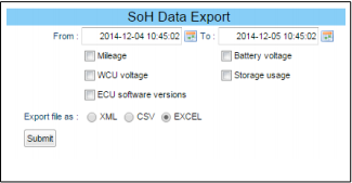 You can export data from SoH tasks to your local computer by using the function “Export SoH data”. Select the cars you are interested in as you can export for more than one car in one export. You select the dates you are interested in getting the data from. Check each item you are interested in. Currently you can select mileage, WCU voltage, ECU software versions, battery voltage, storage usage and diagnostic trouble codes. The file can be exported in CSV format (suitable for Excel and other spreadsheet applications) and in XML format.