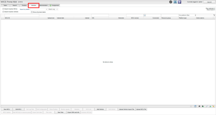 With the first five tabs you can do all the work that is needed to start, stop and handle data to and from vehicles. The fifth tab is not present in all editions of the portal. A figure of the tabs is presented in Figure "User Tabs".