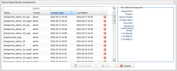 In order to edit an already created assignment navigate to the tab where you choose a signal source and click the View saved assignments button. This will display a window, see Figure "View Assignments", which lists all of the saved assignments created through the wizard, by whom and when it was created. In order to edit an assignment, select it and click Edit and you will start editing it. Simply click Save assignment when you are done and the old version of the assignment will be updated.