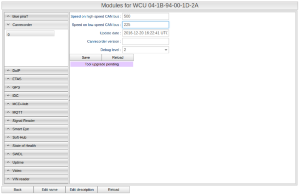 The legacy configuration for the Canrecorder module is shown in Illustration 41.1 below. There are four fields of which two are editable. In order for the canrecorder to work you need to set the high- and low speed CAN bus. The update date says when the last configuration was enabled and the canrecorder version says which version of the canrecorder software is used.