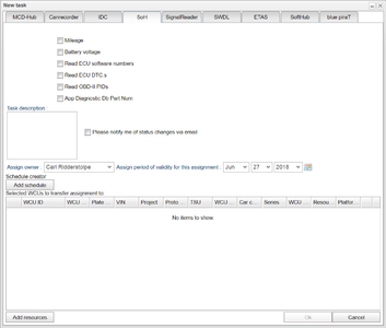 7. Start searching and selecting a WCU by pressing add resources at the bottom left of the screen. There you will get a pop up with 2 boxes, the upper one for searching cars and the bottom one for selected cars. In the top one you can search WCU units with ten different parameters by writing a value and pressing search or ENTER. to select a WCU you drag it from the top to the bottom box so that it appears in the bottom one.