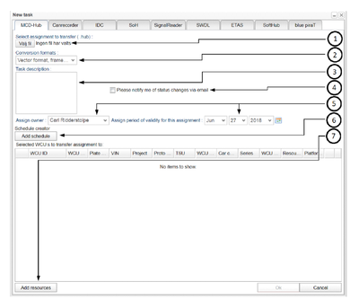 7. Start searching and selecting a WCU by pressing add resources at the bottom left of the screen. There you will get a pop up with 2 boxes, the upper one for searching cars and the bottom one for selected cars. In the top one you can search WCU units with ten different parameters by writing a value and pressing search or ENTER. to select a WCU you drag it from the top to the bottom box so that it appears in the bottom one. | |||