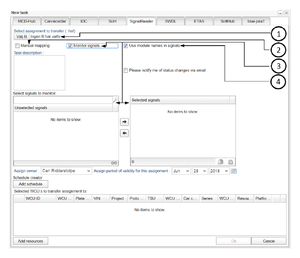 3. With a Signal Reader assignment you can follow WCU signals live by selecting monitor signals. When selected it will come up two boxes under the task description. In the left one you search for signals and drag them over to the right one where the monitored signals are. You can later se the monitored signals through the vehicles tab. It is also possible to copy the signals text in the bottom right corner of the right box. Next to the copy text button you can also paste signals as text where the pasted signal names will be matched against the list of unselected signals | |||
