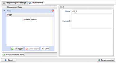 Under the Measurements tab, see Figure 2, you are presented to a table of Measurement Setups and an information window. These measurement setups are the core of a signal reader assignment. They contain Triggers that activate and deactivate on certain conditions provided by the user. Each trigger can contain a Recorder that contains a list of certain signals that will be measured when the start condition for the respective trigger is met. A trigger can also be used to act as a setup switch.