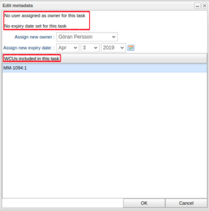 If you want to set an owner and expiry date (or alter values) for a previously created task, right-click the task in the Search view. As seen in illustration "Edit task", a context menu will appear with the option "Edit task". When selecting "Edit task" a new window pops up, as seen in illustration "Edit task owner and expiry date"", where the current task owner and expiry date is displayed. By selecting a user and a expiry date and then pressing OK the database will be updated with the new values.