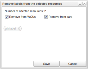 Labels on a resource can be managed (add or remove labels) as described in #Add labels to resources. Alternatively, if only one resource is selected, the "Edit WCU" or "Edit Car" button can be used for a WCU or Car, respectively. The Figure "Edit WCU Dialog" shows the "Edit WCU" dialog. To remove the label "wicewiki", simply click the label and it will disappear. The new state of the WCU is not saved until we click the button "Save". In this view we also have the option to add other labels exactly in the same way as we described in #Add labels to resources.