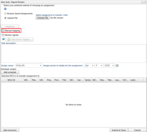 When creating a SignalReader task (New Task and then selecting the "SignalReader" tab) there is a new checkbox, "Manual mapping", as illustrated in illustration "Mappings 1". If you tick this box, the upload of the SignalReader haf-file will work as in previous versions of the portal. If you do not tick this box, then, when a .haf-file is uploaded, the portal will start a process called auto mapping.