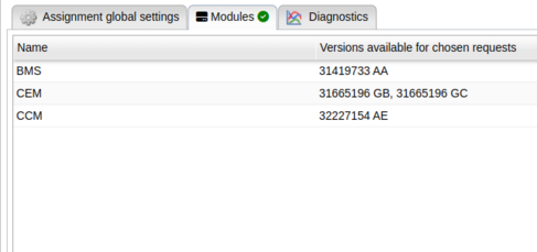The second tab, Modules, shows a summary of which ECUs have been selected from when choosing requests in the Diagnostics tab, as well as the ECU software versions available for the chosen requests.