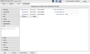 The RP Module configuration view is accessed by pressing the "Modules" button in the "Vehicles" tab. When the "Save" button has been pressed, the RP software components and settings file (and optionally also a X.509 certificate file) are ready to be downloaded to the selected WCUs.